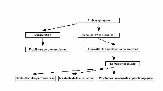 La cause de ce problème est l'obstruction des voies respiratoires hautes, qui déclenche une pause respiratoire. Cette dernière est suivie d'une réaction d'éveil (arousal). La durée de la pause respiratoire dépend de la gravité du SAOS et de la durée de l'existence de ce syndrome. Les patients jeunes ont en général des pauses respiratoires très courtes, qui ne font pratiquement pas baisser l'HbO2, alors que les patients souffrant depuis longtemps de cette maladie ont des pauses respiratoires de plus en plus prolongées, qui entraînent une désaturation sévère d'oxygène. La pause respiratoire est la cause de la réaction d'éveil et de la désaturation. Les réactions d'éveil perturbant sérieusement l'architecture du sommeil sont donc les principales responsables des problèmes des patients. Les désaturations sont secondaires, et si le syndrome des apnées du sommeil dure depuis un certain temps, elles peuvent abaisser la vigilance et les performances intellectuelles, surtout si la saturation d'oxygène est basse de jour également. Le sommeil de mauvaise qualité porte atteinte à la santé. Les désaturations d'oxygène peuvent donc secondairement être à l'origine de problèmes cardiovasculaires [5] (fig. 1).