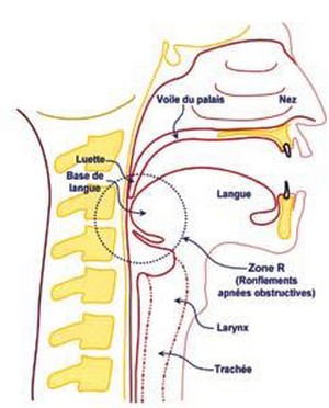 Au fond de la bouche, en arrière la langue, l'espace libre est relativement étroit. L'air doit passer entre la langue, le voile du palais, la luette et la paroi du pharynx. Lors du sommeil, les muscles sont relâchés, hypotoniques. Ils ont alors tendance à s'affaisser ce qui réduit encore le passage. Des conformations anatomiques individuelles, et la forme de la mâchoire inférieure, conditionnent le passage de l'air. Lorsque le voile du palais est long et épais, celui-ci réduit l'espace libre. (Zone R du schéma). Ces structures molles (paroi pharyngée, voile du palais, base de la langue) s'accolent l'une contre l'autre, et empêchent l'air de passer librement. Il se produit alors une vibration des tissus qui se traduit par le ronflement. Lorsque ce passage est trop réduit, la base de la langue crée un phénomène de soupape. Ce blocage empêche alors complètement l'air de pénétrer dans les poumons. Les efforts inspiratoires accentuent encore ce blocage, comme un bouchon placé à l'entrée de la trachée. C'est l'apnée obstructive. Après quelques inspirations inefficaces, un phénomène réflexe stimulera le système nerveux central qui déclenchera un réveil partiel. Cette stimulation redonne un peu de tonus aux muscles pharyngés qui se contractent et libèrent le passage. L'air pénètre à nouveau dans les poumons lors d'une grande inspiration, ample et souvent bruyante. Ce phénomène a tendance à se reproduire régulièrement durant la nuit.