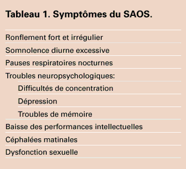 La plupart des patients ayant un SAOS ont une hypertension à prédominance diastolique. Les conséquences à long terme d'un SAOS sont une hypertension artérielle pulmonaire et un cœur pulmonaire [9]. Ils sont plus souvent victimes d'infarctus du myocarde et d'un accident cérébro- vasculaire [5]. Il est recommandé de demander aux patients à risque cardiovasculaire s'ils souffrent d'un SAOS, et d'en confirmer le diagnostic le cas échéant.